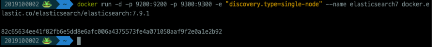 docker run -d -p 9200:9200 -p 9300:9300 -e "discovery.type=single-node" --name elasticsearch7 docker.elastic.co/elasticsearch/elasticsearch:7.9.1